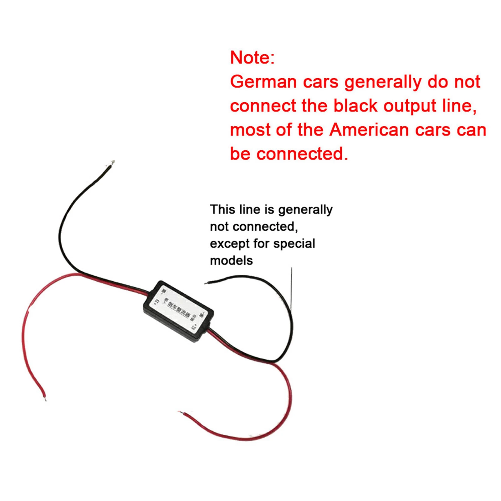 Easy to install, input connect with reversing light positive and negative, output wire connect with camera positive and negative.